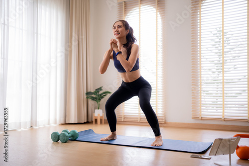 Fototapeta premium Asian adult woman performs squat exercise home living room achieving fitness goals daily workout routine wellness lifestyle indoor training session bright natural light