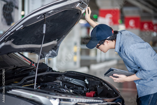 Obraz premium Asian auto mechanic holding digital tablet checking car engine under the hood...