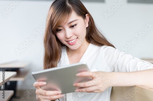 Fototapeta premium Asian beautiful female student study with tablet in classroom