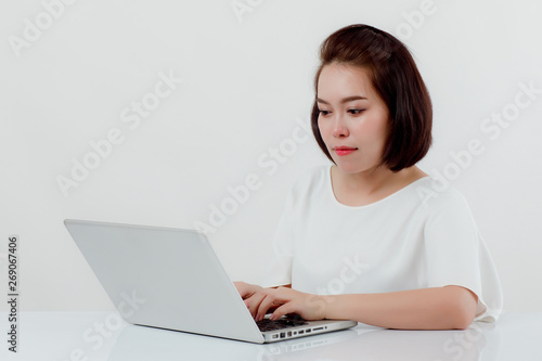 © Ekkasit A Siam, Naklejka premium Asian beautiful woman Sitting in a white shirt On the front desk, there is a laptop computer placed. Expression There is work stress. With a white background