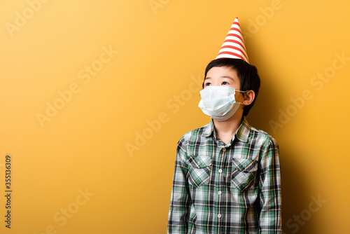 Obraz premium asian boy in birthday party cone and medical mask on yellow during self...
