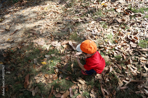 © meepoohyaphoto, Fototapeta premium Asian boy is sitting in the garden.