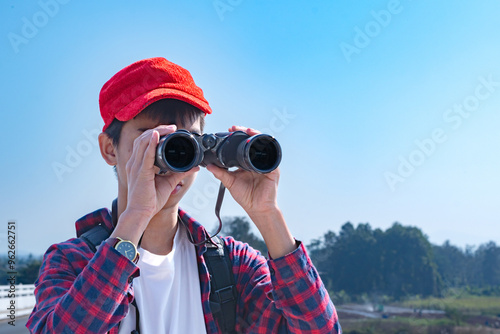 Obraz premium Asian boy wearing a red cap and plaid shirt, looking through binoculars while...