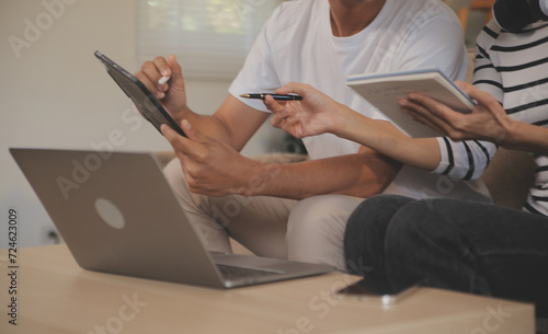 © Kansuda, Naklejka premium Asian business people discussing team of young asian entrepreneurs discussing business, Asia business team meeting discussion talking.
