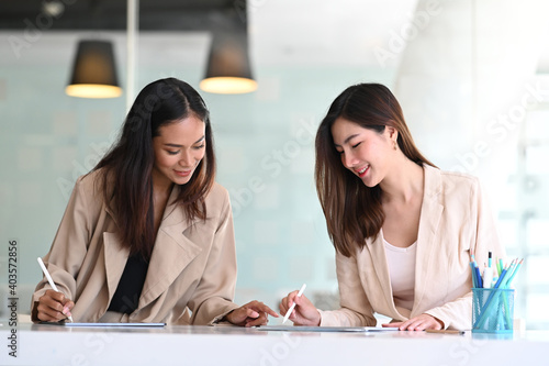 Fototapeta premium Asian business people working with digital tablet and searching data for business startup plan and strategy in modern office.