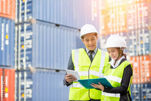 Fototapeta premium Asian businessman and Asian secretary working with container Cargo freight...