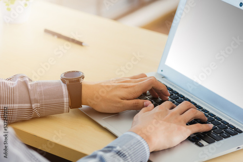 Fototapeta premium Asian businessman working on his laptop computer with blank copy space screen he typing on keyboard at home office desk. The man play social media on computer table