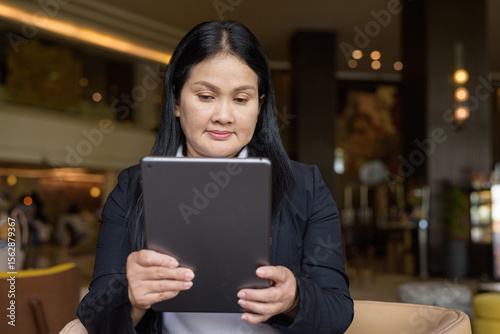 Fototapeta premium Asian businesswoman in cafe restaurant using digital tablet computer
