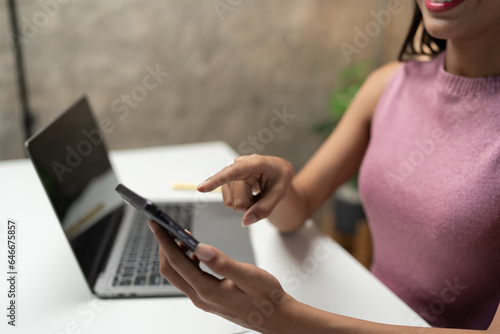 © Phimwilai, Naklejka premium Asian businesswoman sitting and working with laptop computer Use the phone to talk via video call. online in financial business Business ideas to start online through the media.