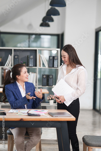 © Thitisak, Fototapeta premium Asian businesswoman sitting at work using laptop talking and consulting in office