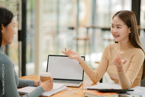Fototapeta premium Asian businesswoman using a tapered laptop, sitting and talking in the office