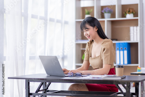 Obraz premium Asian Businesswoman Using laptop computer and working at workplace with...