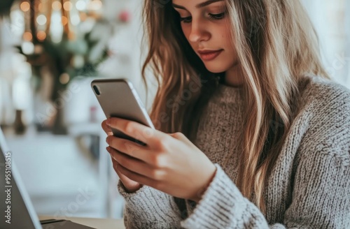 © Антон Сальников, Fototapeta premium Asian businesswoman using mobile smart phone, surfing the internet while working online on laptop computer, seated at modern office