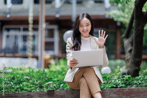 © Phimwilai, Fototapeta premium Asian businesswoman video calling and waving outdoors
