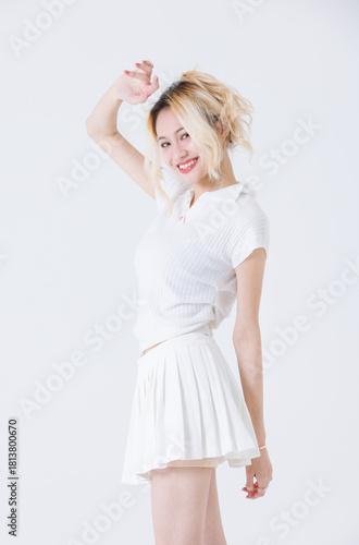 © Bangkok Click Studio, Naklejka premium Asian confident attractive beautiful young woman blonde hair tied stand wearing white shirt top mini skirt sport background studio, portrait lifestyle fashion outfit trendy style pose look at camera.
