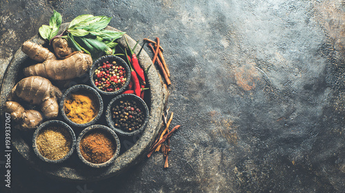 © Small, Obraz premium Asian cuisine ingredients beautifully arranged on a rustic stone surface with fresh herbs and spices.