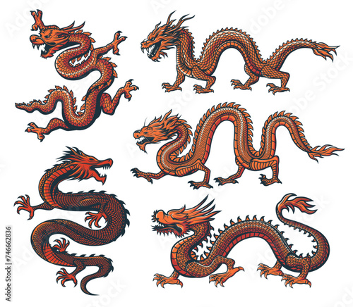 © Vector Tradition, Fototapeta premium Asian dragon, China zodiac or Chinese and Japanese oriental culture monster, vector animal. Asian dragons for Chinese lunar new year festival and prosperity symbol or tattoo of oriental flaying dragon