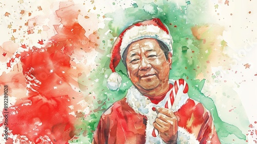 © Jafree, Fototapeta premium Asian elderly man dressed as Santa Claus holding a candy cane in a watercolor illustration. Concept of Christmas, holiday spirit, festive season, joyful celebration
