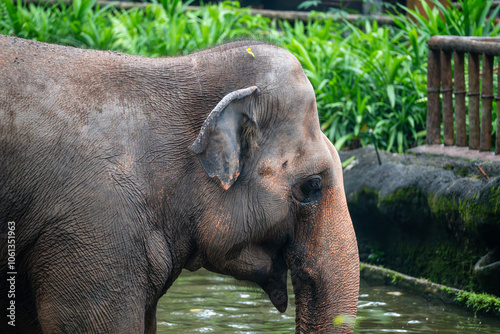 © Darcy, Naklejka premium Asian Elephant (Elephas Maximus, Asiatic Elephant, Indian Elephant) close up on face or head, in water pond or pool