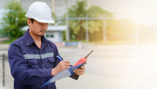 Fototapeta premium Asian engineer in safety uniform and white helmet taking note on clipboard on...
