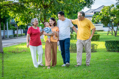 © SKW, Obraz premium Asian family and baby are in the grass. Everyone looks happy.