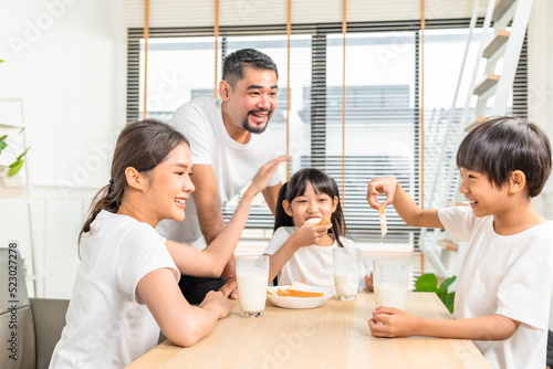 © anon, Fototapeta premium Asian family enjoying breakfast at living room. little girl daughter sitting on table, drinking milk with smiling father and mother in morning. Happy family at home.
