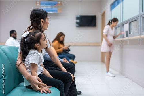 © Kawee, Obraz premium Asian family patient wait on line queue to receive medicine in hospital.
