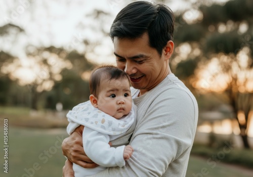 © SERHII, Obraz premium Asian father happily holding baby in tranquil park at sunset