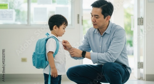 © Anna, Obraz premium Asian father helping young son with backpack in school classroom setting