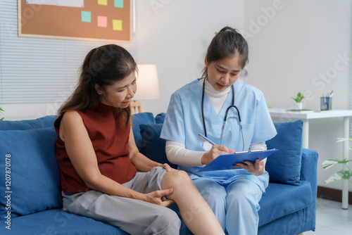 Fototapeta premium Asian female doctor visiting senior patient and writing notes about knee pain on clipboard during home visit