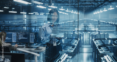 Fototapeta premium Asian Female Systems Administrator Standing in a Glass Office, Adjusting...
