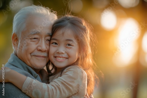 © James, Obraz premium Asian girl hugging her grandfather, smiling and happy, in a park background. Family concept and love for elderly people with copy space.