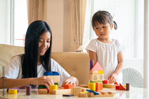 Fototapeta premium Asian girl looking at her happy mixed race sister playing wooden color block an education toy at living room. a family activity concept