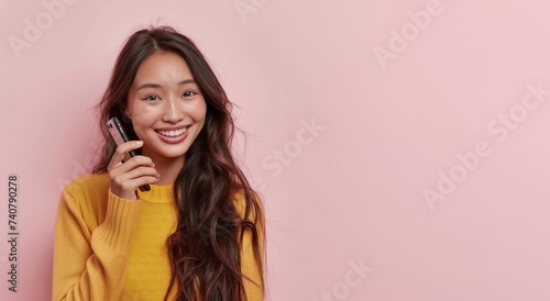 © Danko, Fototapeta premium Asian girl using smartphone isolated on pink background with copy space for your text