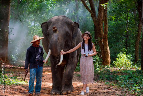 © Thirawatana, Fototapeta premium Asian girl walking with elephant and mahout in the forest. Tourism asian women holding camera in elephant village.