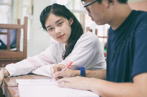 © tuiphotoengineer, Obraz premium Asian Group of students sharing with the ideas for working on the campus lawn