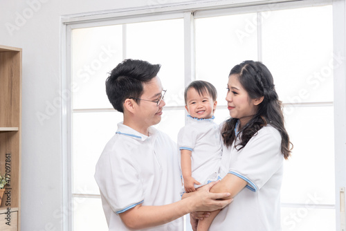 Fototapeta premium Asian happy family, father and mother kissing their baby at home.
