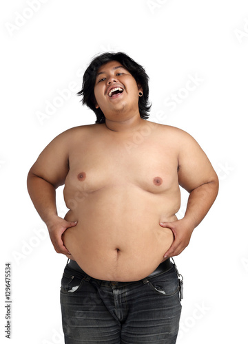 © settaphan, Fototapeta premium Asian Happy Fat Boy Acting Bodybuilding feeling good Health isolated on white background