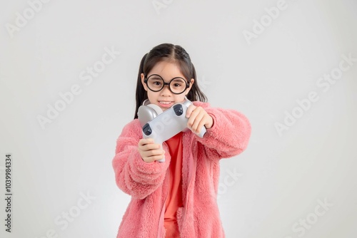 © Tanatpong, Fototapeta premium Asian happy portrait young kid girl smile lifestyle games technology holding joystick game playing on hands studio shot isolated white background with copy space.