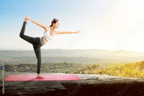 © Leo Lintang, Fototapeta premium Asian healthy woman practicing yoga on the carpet on rock