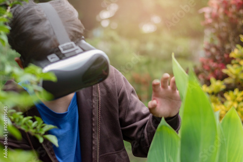 © Sophon_Nawit, Fototapeta premium Asian highschool boy explores nature outside the classroom, observing trees and plants by using VR headsets with immersive technology to study details of leaves and bark up closely, soft focus.