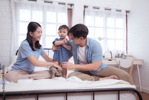 © Wosunan, Fototapeta premium Asian kid and parents enjoying are having fun applying cream, powder and dressing up