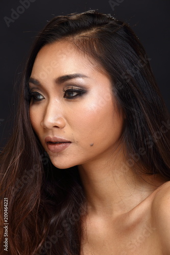 © Jade, Fototapeta premium Asian Long straight black hair tan skin woman in Black dress