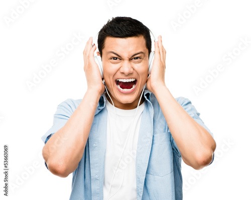 Naklejka premium Asian lsitening to music student heaphones white background
