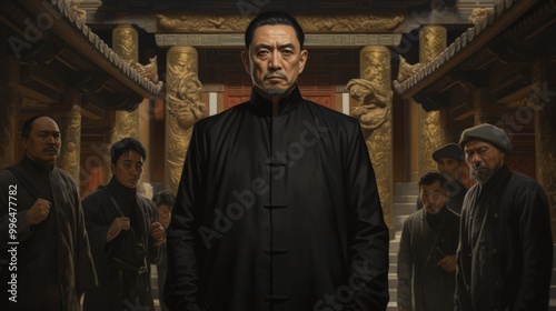 © mehaniq41, Naklejka premium Asian mafia boss with gangsters in oriental architecture background. Neural network ai generated art