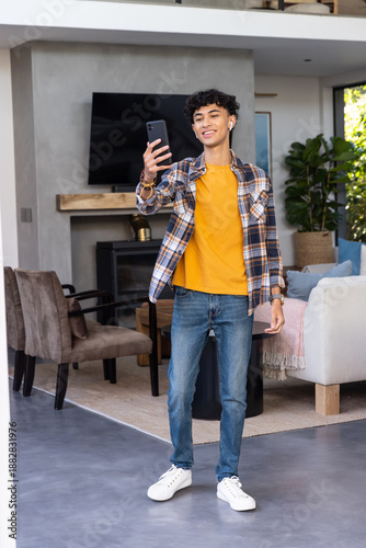 Fototapeta premium Asian male student standing in living room holding smartphone while wearing wireless earbuds