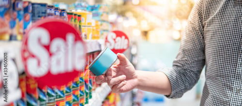 Fototapeta premium Asian man customer choosing canned food from shelf in supermarket or grocery...