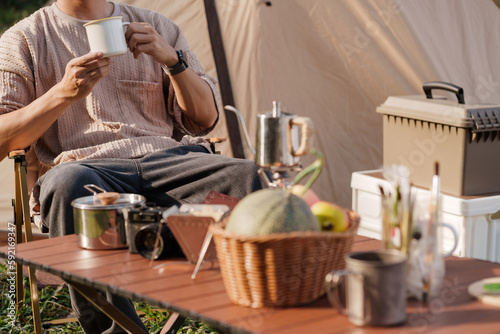 © mojo_cp, Obraz premium Asian man drinking coffee enjoying camping outdoors in nature. Man traveler hands holding cup of coffee.