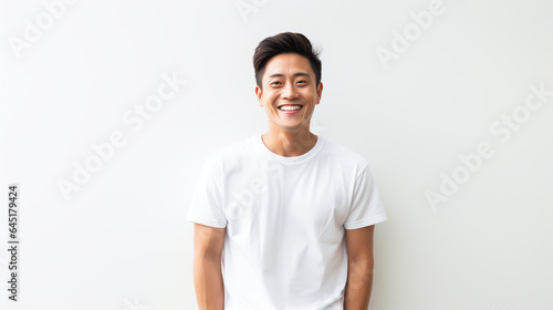 © Phoophinyo, Obraz premium Asian man happy and happy, portrait of asian man with wow face, happy man, looks back at the camera, man wearing white t - shirt is delighted with light gray background.