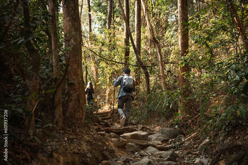 © Anciens, Naklejka premium Asian man is hiking in the forest.